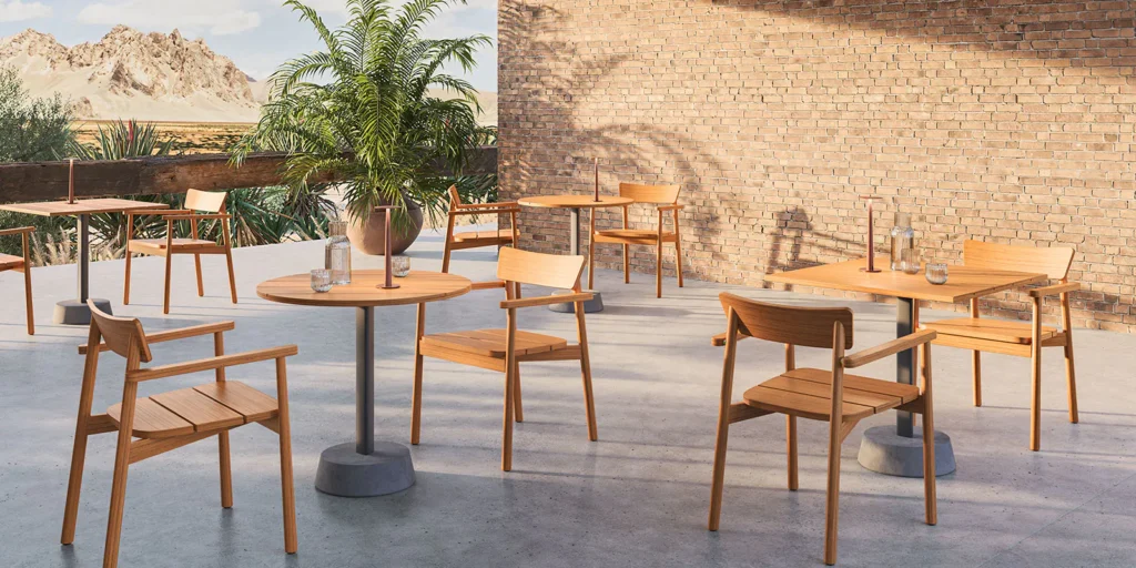Egy kültéri asztalokat felvonultató kínálat, mely arra született, hogy különböző terekhez alkalmazkodjon, a közületi szférától a lakosságiig.