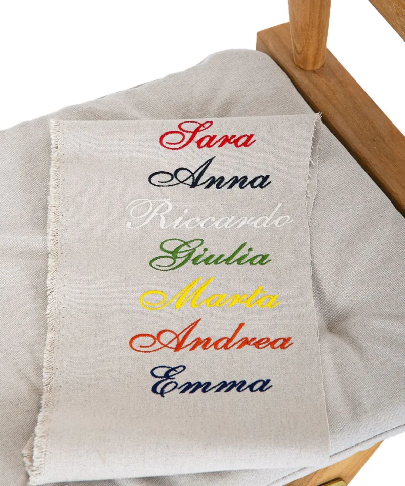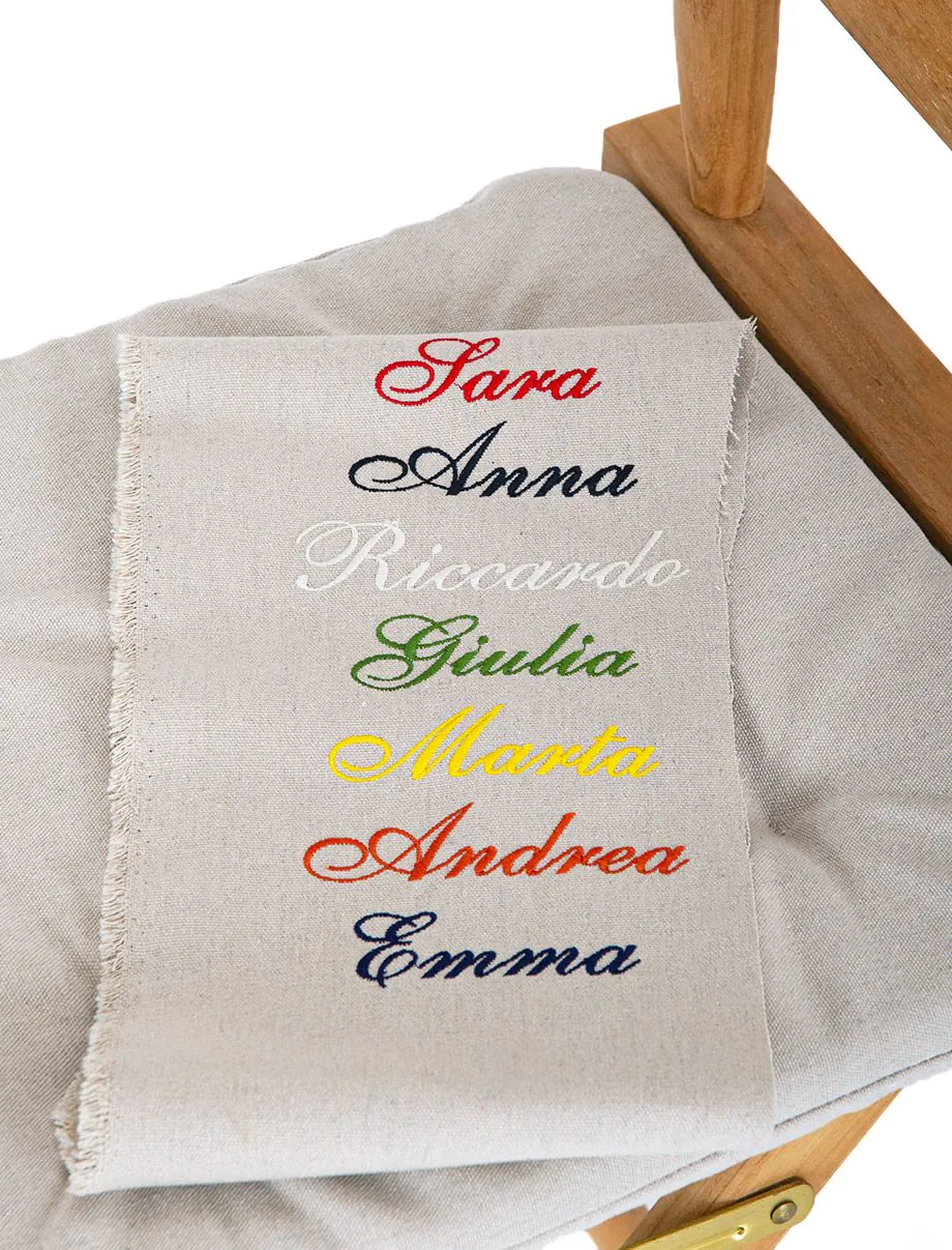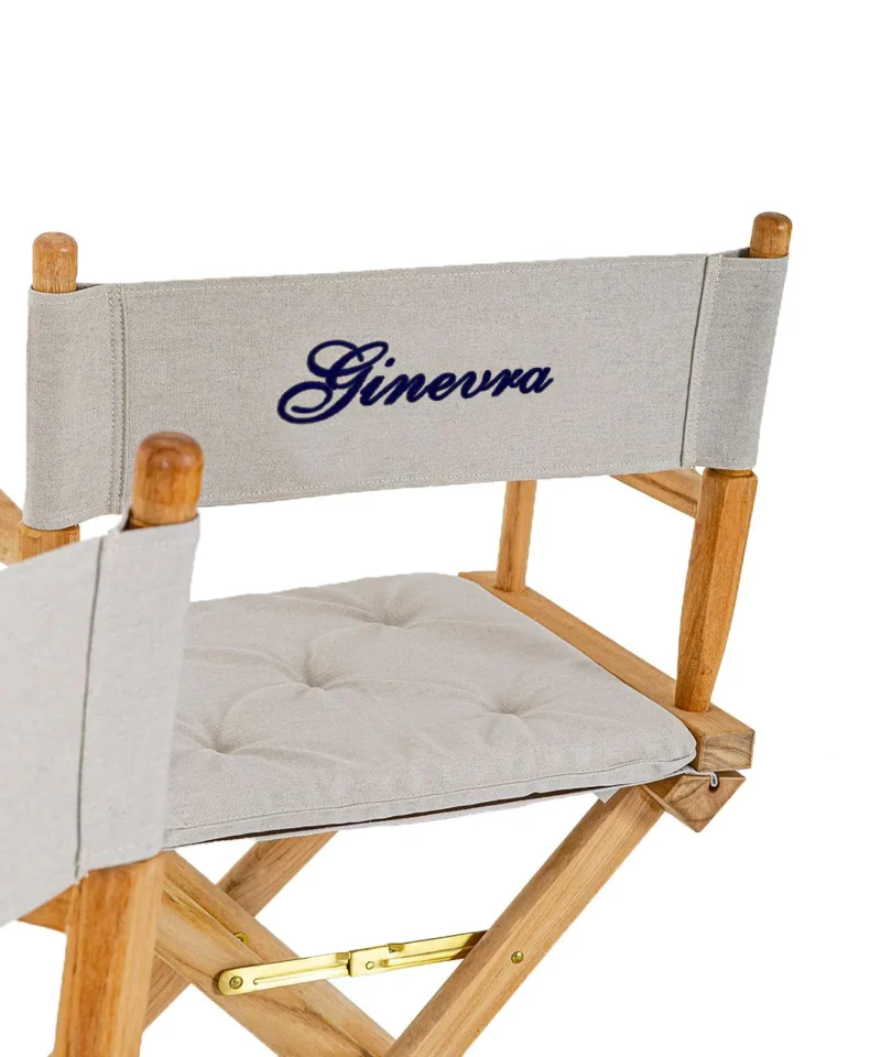 Fedezze fel az Unopiù rendezői kis karosszékét, amely elegáns és testreszabható megoldást kínál a kültéri terek igényes kialakításához. A háttámla személyre szabható a nevével, amelyet tapasztalt kézművesek gondosan hímeznek fel.